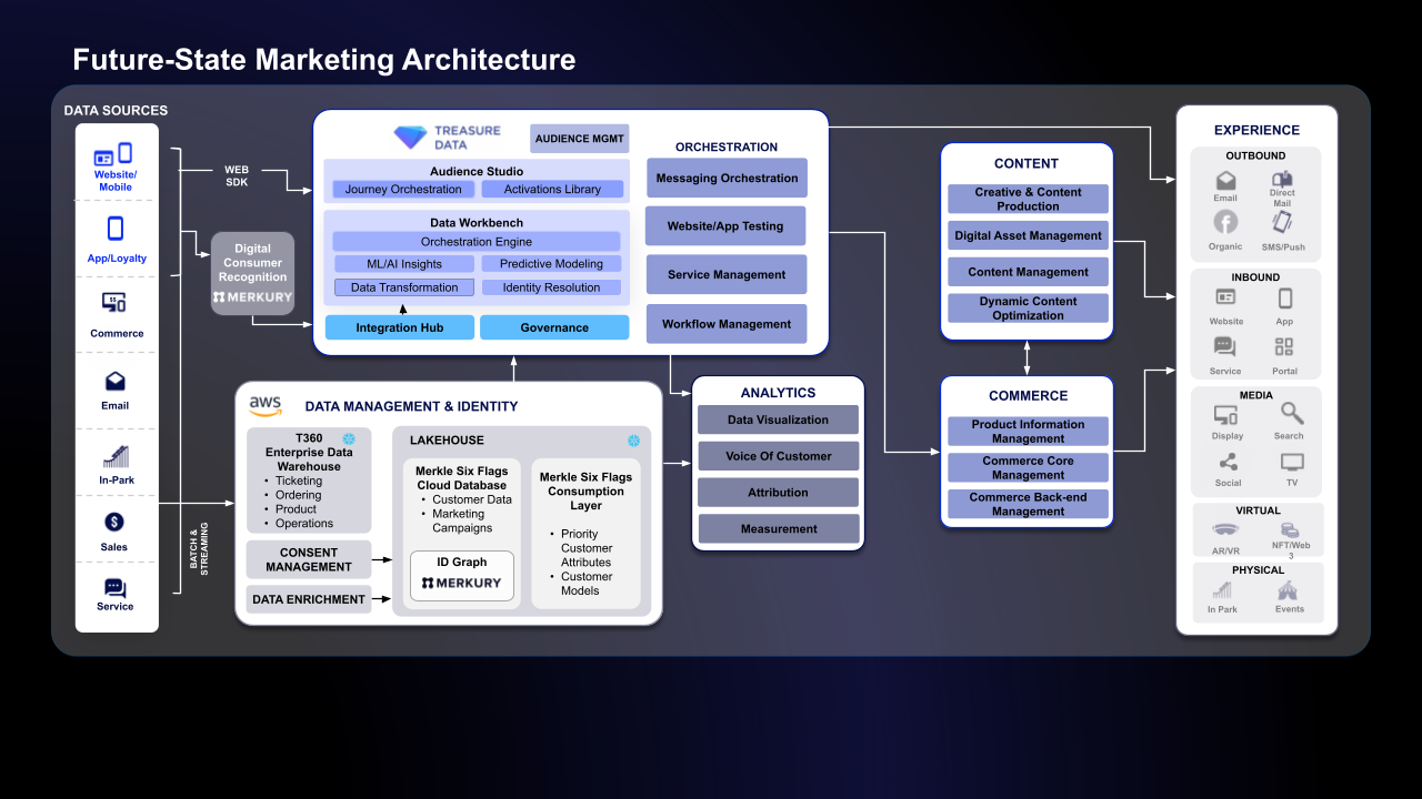 Six Flags, following its merger with Cedar Fair, faced the challenge of unifying two distinct and complex digital ecosystems to deliver a seamless, “frictionless fun” guest experience. Partnering with Merkle and Treasure Data, they implemented a thoughtfully designed customer data platform (CDP) that unified fragmented data and provided real-time guest insights, saving $1 million in tech consolidation.